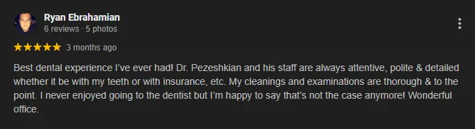 Get personalized care in a comfortable, family-friendly environment. From dental implants to cosmetic and general dentistry, Dr. Pezeshkian and his team are here to keep your smile healthy and confident.